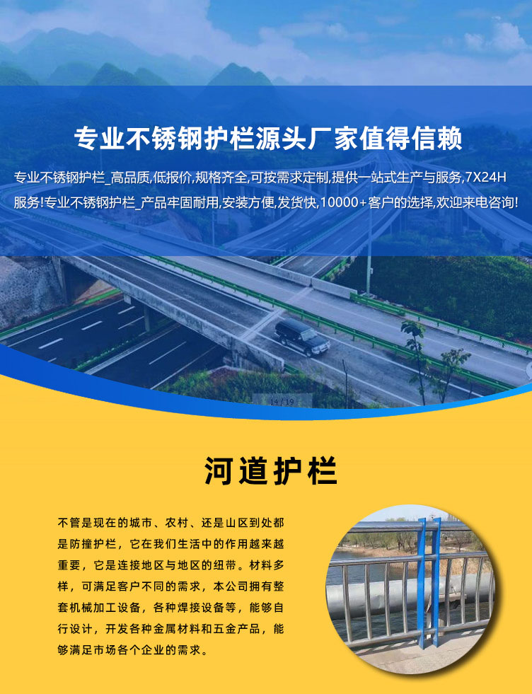 河道護(hù)欄不僅具有不銹鋼管的豪華美觀和現(xiàn)代氣息,又具有普通碳鋼管的堅(jiān)韌性。是價(jià)昂不銹鋼管的替代品,它與鋼板立柱配合,做成城市、道橋等的安全欄桿。 不僅牢固、大方,且可造型各異,給都市別一種亮麗風(fēng)景線。